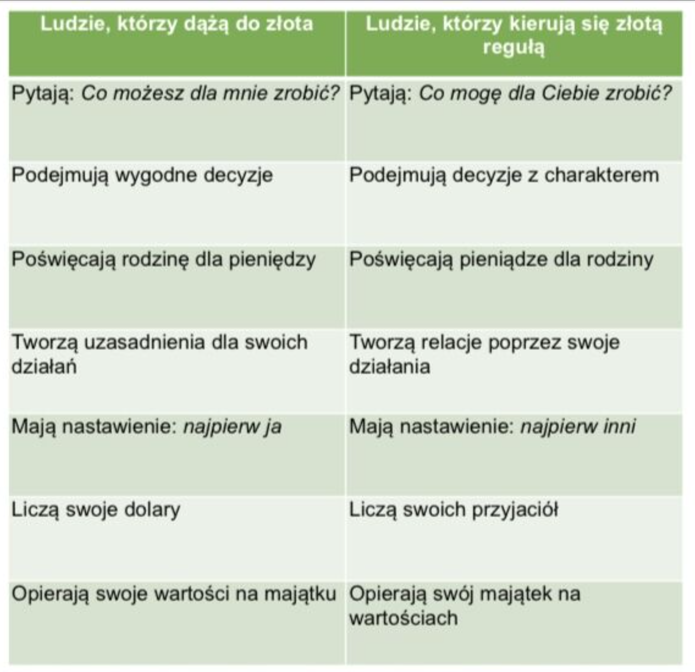Jeden z przedsiębiorców i i autor bestsellerów poproszony przez wydawnictwo o napisanie książki pt. „Etyka w biznesie” odmówił. Powiedział, że nie istnieje coś takiego jak etyka w biznesie, istnieje po prostu etyka. Jednym z naszych problemów jest to, że etyka nigdy nie jest kwestią biznesową, społeczną, ani polityczną. Zawsze jest to kwestia osobista. Przeprowadzono ankietę wsród przedsiębiorców, gdzie pytano o to, jakich ludzi chcieliby zatrudniać. 80 % ankietowanych na pierwszym miejscu postawiło uczciwość. Jeremy Farmer, weteran działu kadr w Bank One w Chicago, powiedział, że w jego firmie w większym stopniu bierze się teraz pod uwagę etykę w czasie rekrutacji pracowników. A organizacje zajmujące się prognozami rynku, już od wielu lat, wartości przedstawiają jako kompetencje przyszłości. Zatrudniamy ludzi z powodu ich umiejętności, ale zwalniamy z powodu wartości. Wydaje się, że filozofowie, teolodzy, nauczyciele, prawnicy nadmiernie skomplikowali temat etycznego zachowania. Podczas gdy wystarczy, że będziemy trzymać się jednej tylko zasady we wszystkich kwestiach etycznych. Ta zasada to tzw. Złota Reguła. Brzmi ona: Traktuj innych tak, jak sam chciałbyś być potraktowany. Etyka wiąże się z działaniem. Jest aktywnym czasownikiem. Nie musisz znać niuansów filozofii czy prawa. Wystarczy, że po prostu wyobrazisz sobie siebie na miejscu innej osoby. Nawet małe dziecko potrafi to zrozumieć. Dostrzeganie wartości innych nie dlatego, że potrafią coś zrobić, ale po prostu dlatego, że są ludźmi, jest fundamentem złotej reguły. Złota reguła zaczyna się od Ciebie. Traktuj innych tak, jak sam chciałbys być potraktowany.